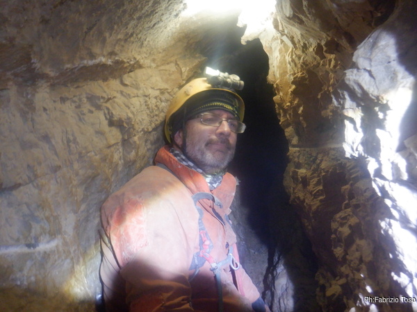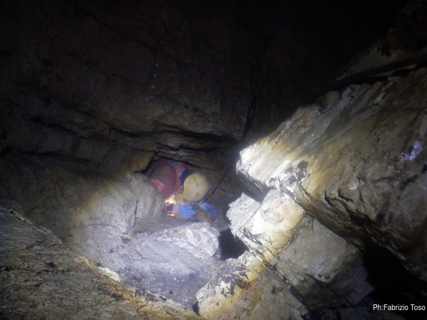 Arrivati al punto dove il meandro ridiventa impraticabile iniziamo a lavorarlo dandoci spesso il cambio. Sotto di noi, nel punto che stiamo cercando di allargare si sentono le voci dei nostri amici della squadra “destra”, evidentemente i due rami si incontrano di nuovo. Lavoriamo con impegno nella speranza di ricongiungerci.