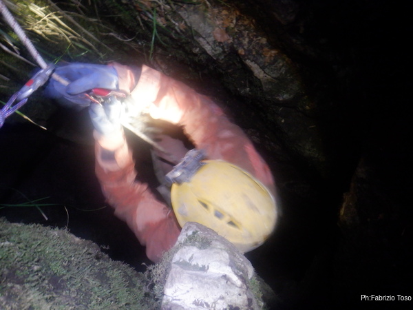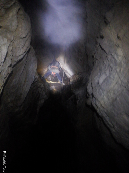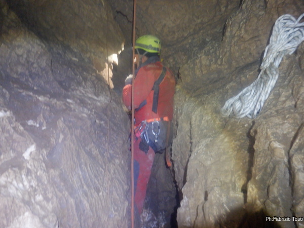 In breve mi trovo a entrare pure io. Scendo il primo pozzo dove ritrovo Fabio e Francesco. Fabio vuole attendere l’arrivo di Marco quindi mi affida Francesco che e’ alla sua prima visita alla grotta.