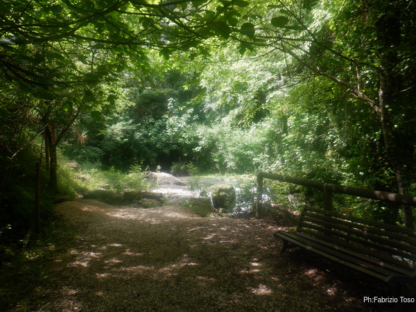 Un arrivo laterale di acqua con un greto di sassi di fiume.
