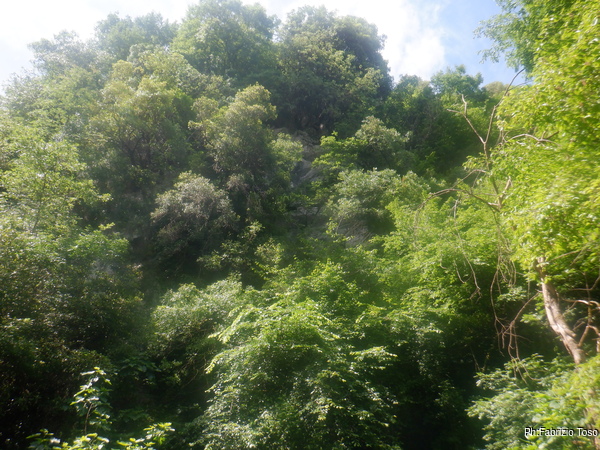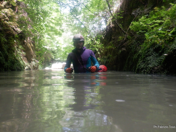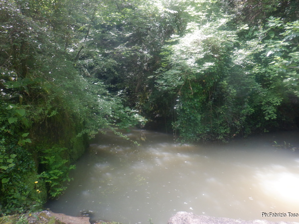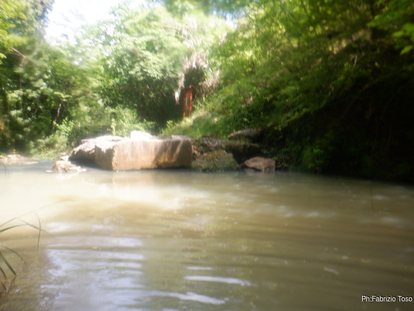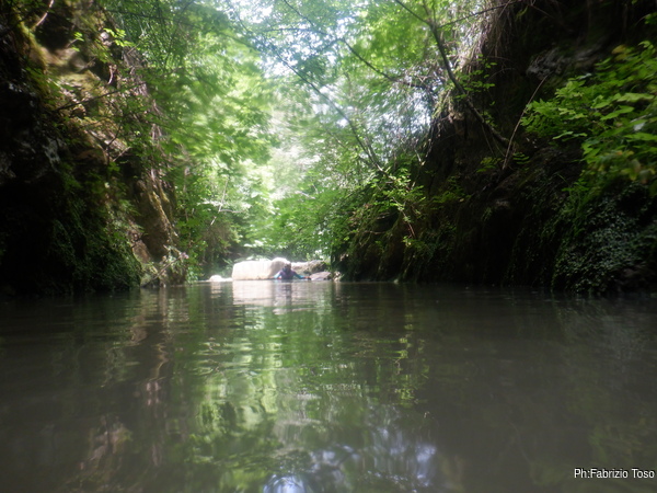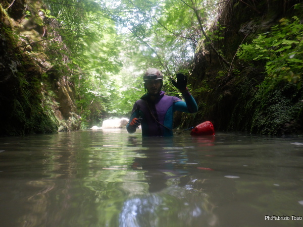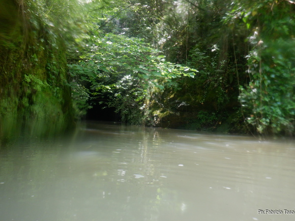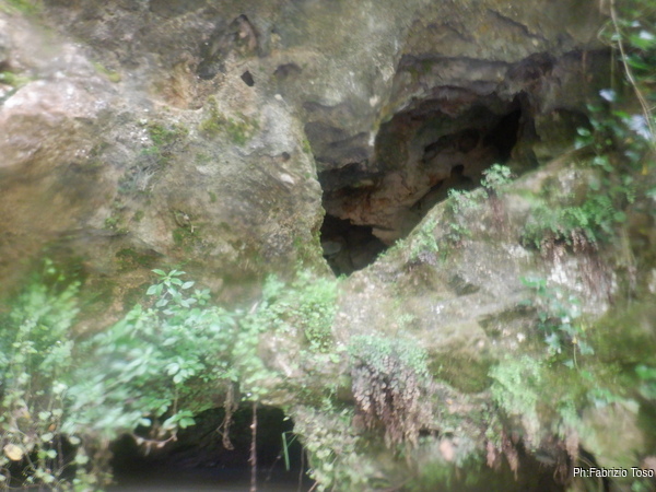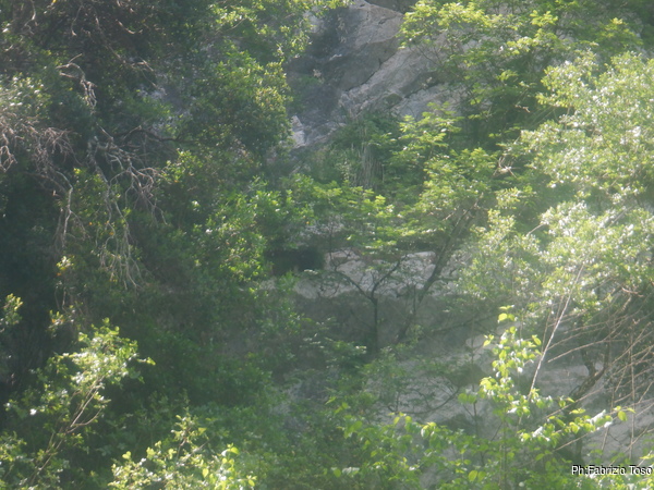 Preparandomi mi guardo intorno. In alto, tra la vegetazione si intravede la parete di roccia…mi sembra ci sia un “nero” interessante, provo a inquadrarlo con lo zoom ma non risolvo molto. Mi annoto mentalmente di chiedere ad Augusto se sono mai stati cercati buchi su questa parete, potrebbero esserci rami fossili della grotta o magari una risorgenza di “troppopieno” che fa, o faceva, defluire le acque in eccesso durante le piene piu’ intense.