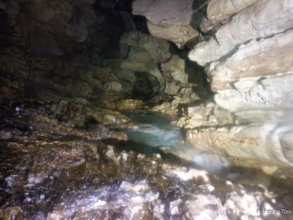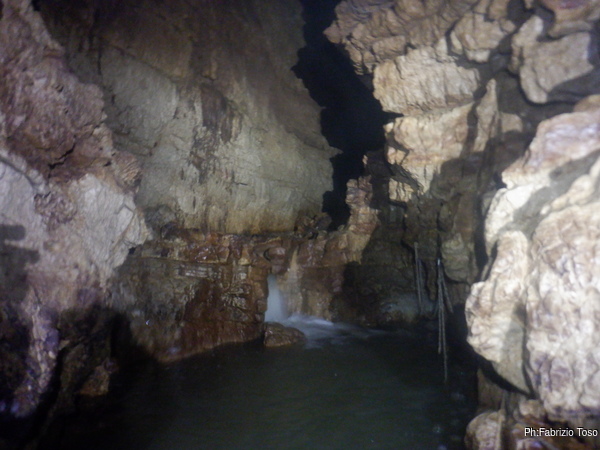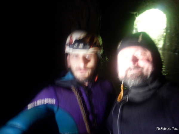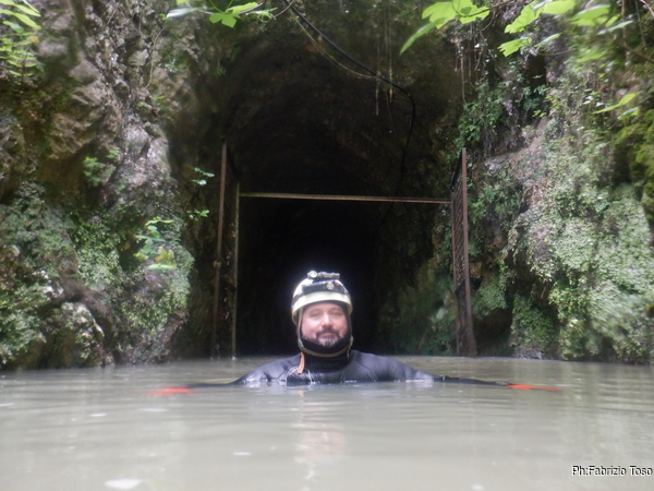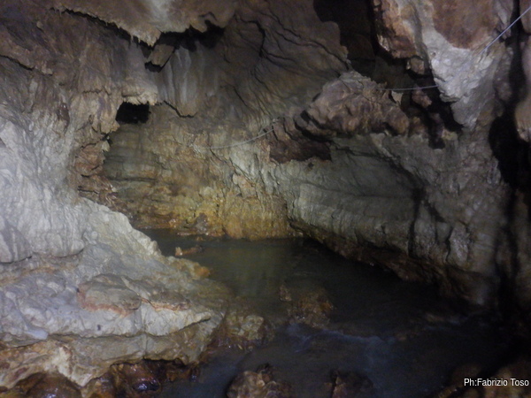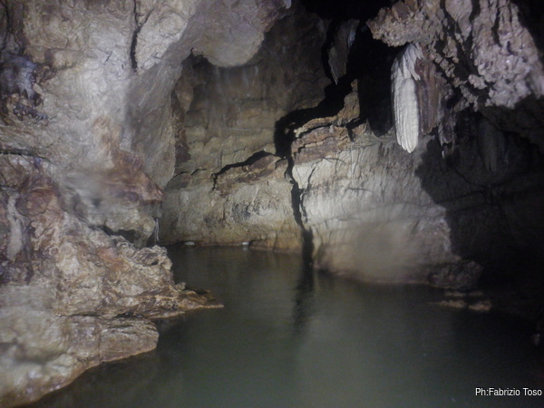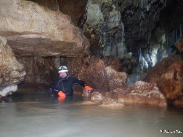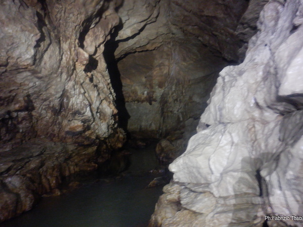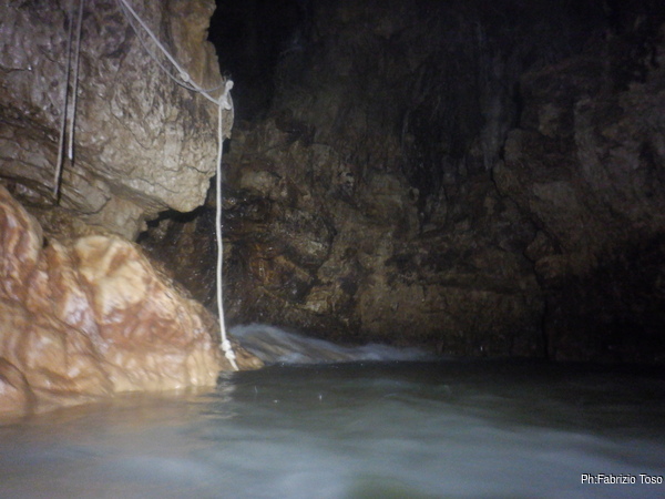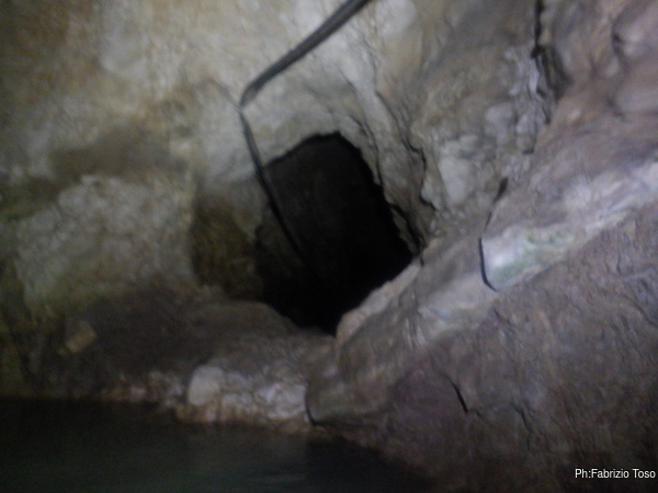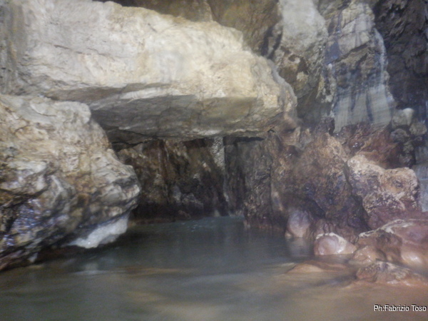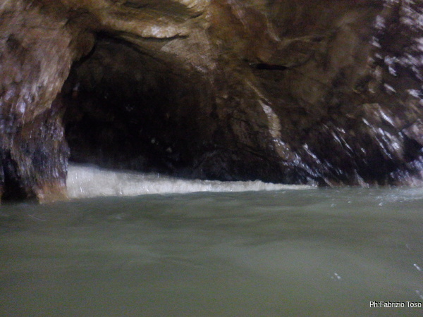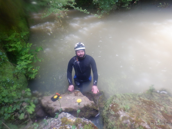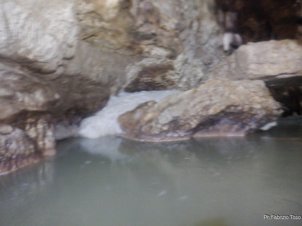 Eccomi arrivato. Oggi l’acqua e’ torbida, peccato, deve esserci stata una piccola piena che ha mosso limo e lo ha fatto tracimare oltre il sifone che solitamente fa da barriera per la sporcizia che arriva dall’ingresso naturale della grotta, ovvero l’inghiottitoio, anche conosciuto con il nome di grotta di Pastena. Sembra strano ci possano essere due nomi per la stessa cavita’, ma andando a vedere la storia della loro scoperta ed esplorazione se ne capisce facilmente il perche’.