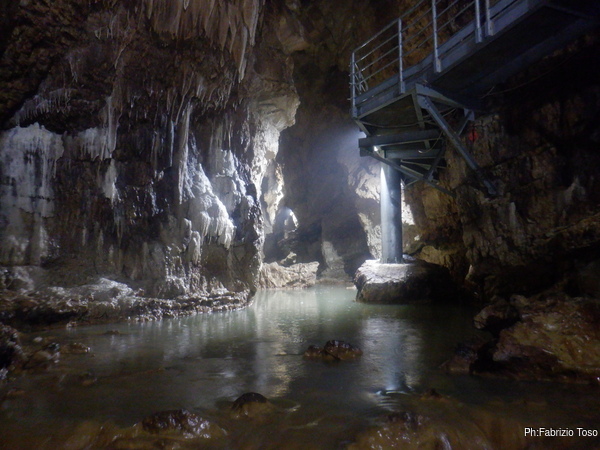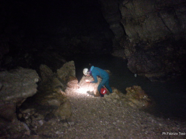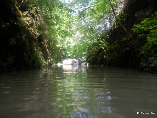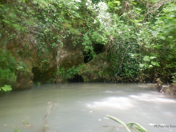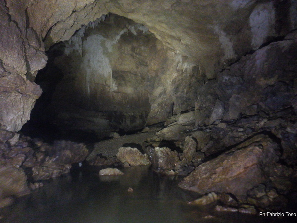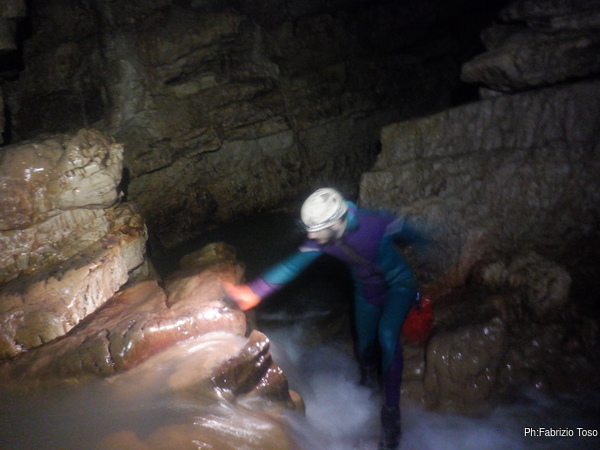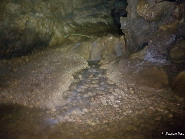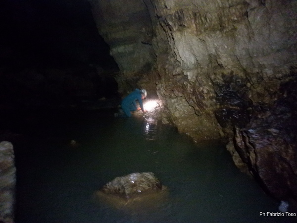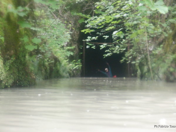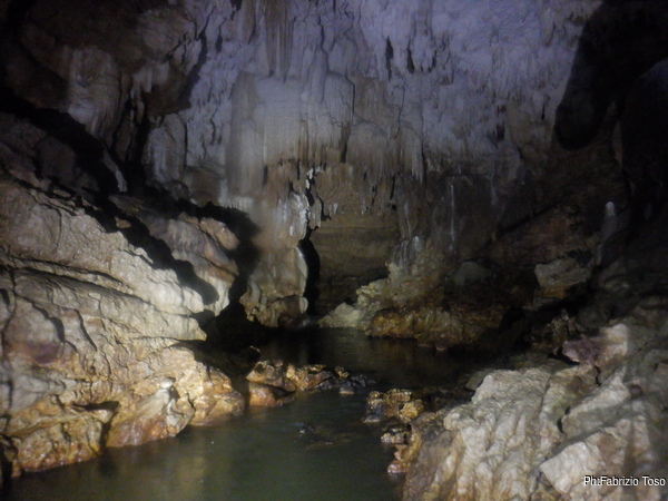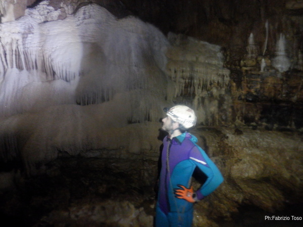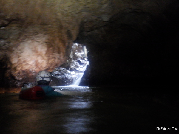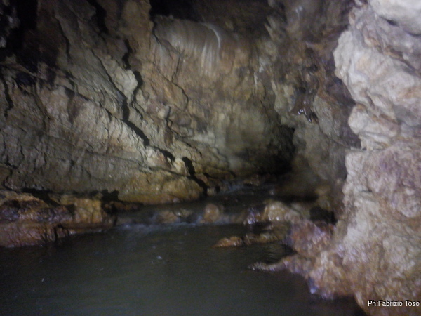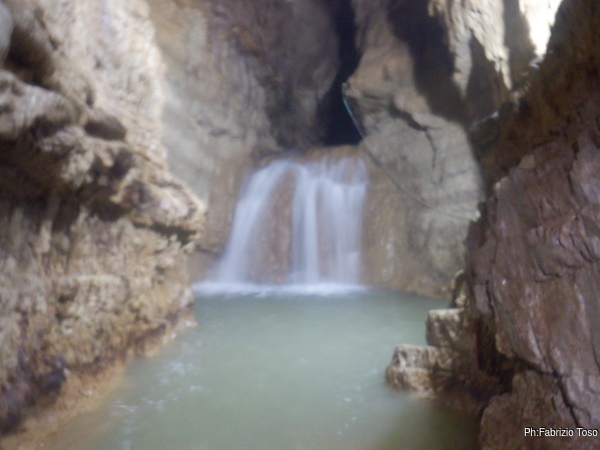Eccomi arrivato. Oggi l’acqua e’ torbida, peccato, deve esserci stata una piccola piena che ha mosso limo e lo ha fatto tracimare oltre il sifone che solitamente fa da barriera per la sporcizia che arriva dall’ingresso naturale della grotta, ovvero l’inghiottitoio, anche conosciuto con il nome di grotta di Pastena. Sembra strano ci possano essere due nomi per la stessa cavita’, ma andando a vedere la storia della loro scoperta ed esplorazione se ne capisce facilmente il perche’.