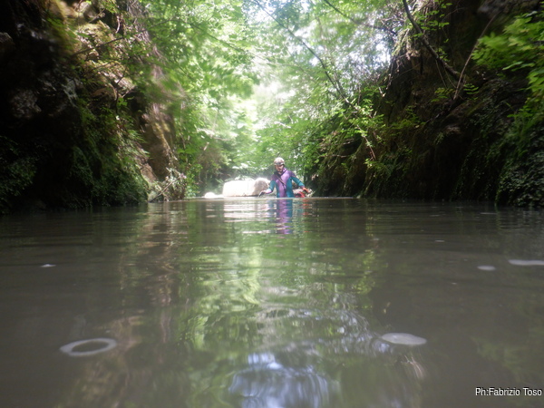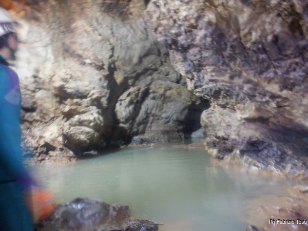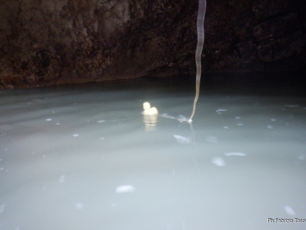 Proseguiamo per la galleria iniziale. Oggi l’acqua, oltre a essere torbida e’ anche piu’ alta del solito di almeno una settantina di centimetri, le due cose rendono piu’ faticoso camminare, io mi arrangio mettendomi a nuotare ogni volta che posso.