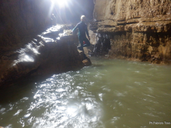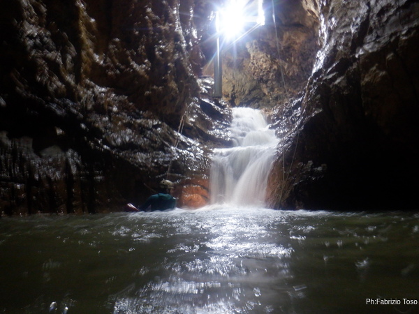 Preso dall’allegria mi tuffo in acqua per raggiungere la cascata solo che dimentico di non avere le lampade impermeabili. Ovvero, almeno una delle due, quella che sto usando (la seconda e’ di scorta) sembra decisamente non esserlo. Infatti dopo il tuffo lei accusa il colpo e inizia a lampeggiare per manifestare la sua contrarieta’ al contatto con l’acqua. Mi spiace per lei, la prossima volta evitero’ di portarla. Esco all’asciutto e faccio una foto a Luca che si appresta a raggiungermi.