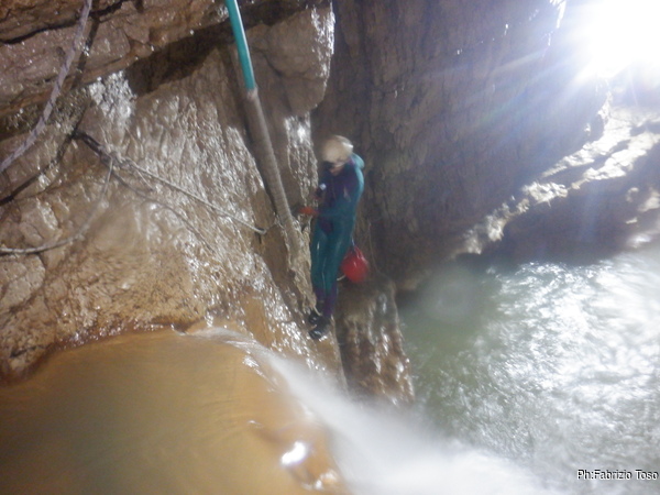 Un tratto di grotta armato con corde fisse messe molto in alto, da utilizzare quando l’acqua e’ veramente troppa.