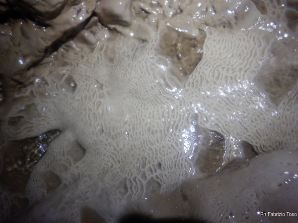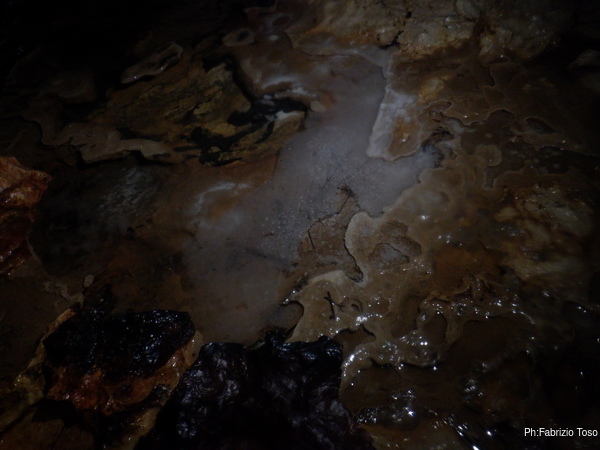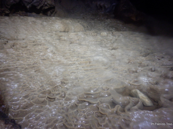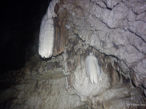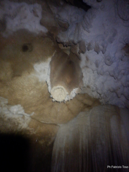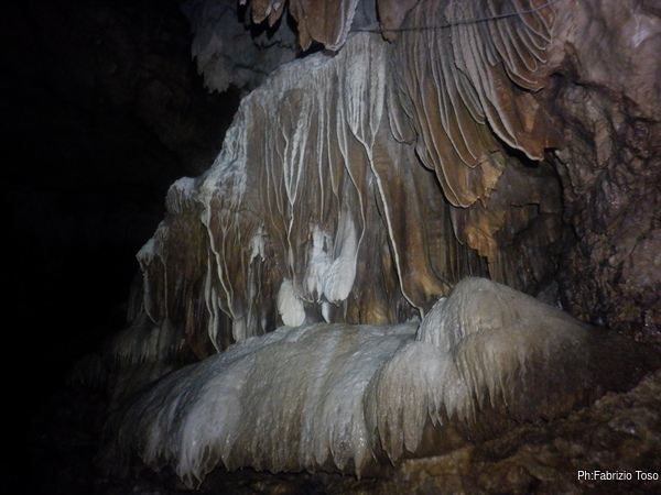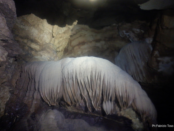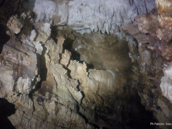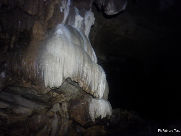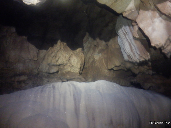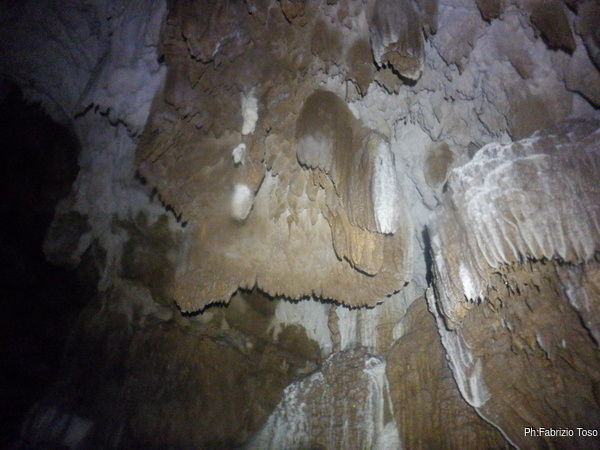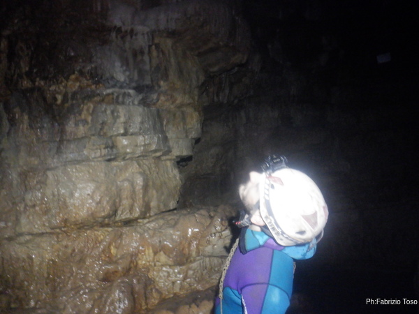 Ogni tanto costringo Luca a una sosta per illuminare punti della grotta che mi piacciono, lui ha una torcia molto potente e invece la mia lo e’ meno e inoltre e’ ancora offesissima per l’inzuppata e continua a lampeggiare con sdegno.