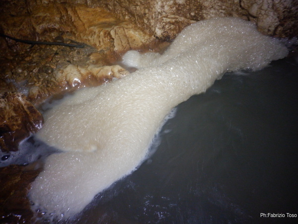 La sporcizia portata dalla piena crea delle sacche di schiuma dall’aspetto ben poco salubre.