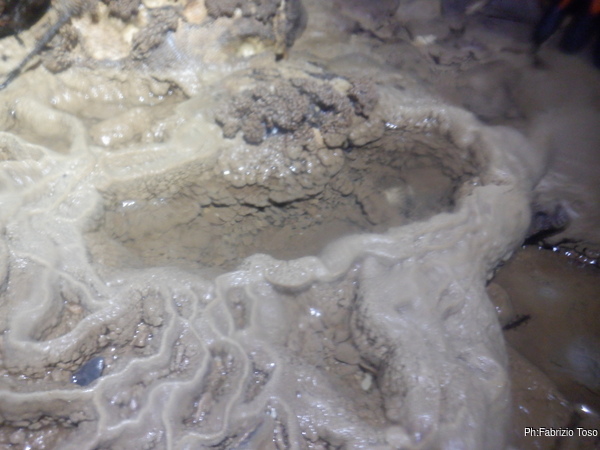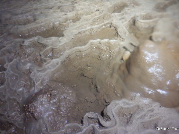 Proseguiamo la nostra passeggiata continuando a cercare diramazioni laterali e sassolini interessanti. La mia lampada e’ sempre piu’ offesa e spesso si spegne lasciandomi al buio. Chiedo l’ora a Luca, sono le 12.15, tra un quarto d’ora dobbiamo riprendere per l’uscita, le 2 ore promesse ad Augusto stanno avviandosi alla fine.
