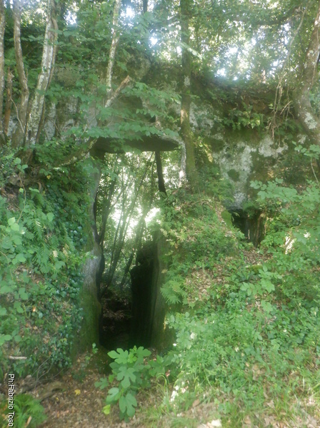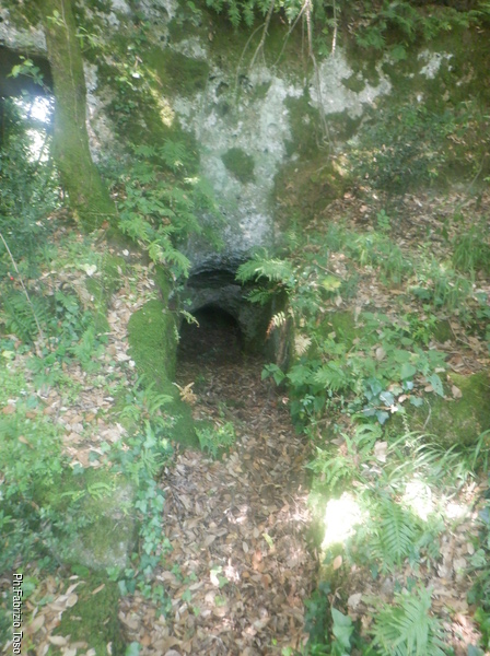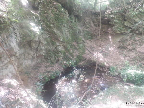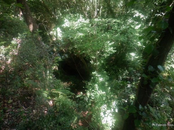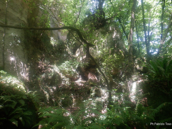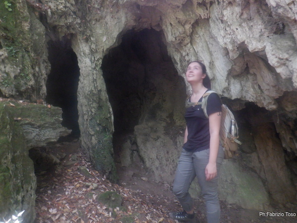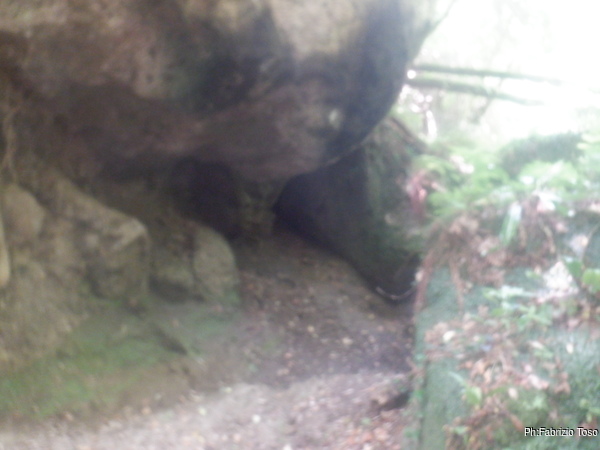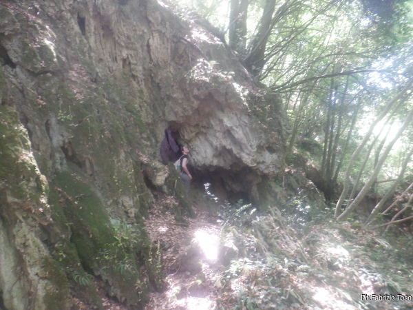 Dopo qualche minuto di cammino arriviamo a uno spiazzo dove ci indicano un passaggio seminascosto tra le frasche. Mi addentro e inizio a vedere la fantomatica grotta.