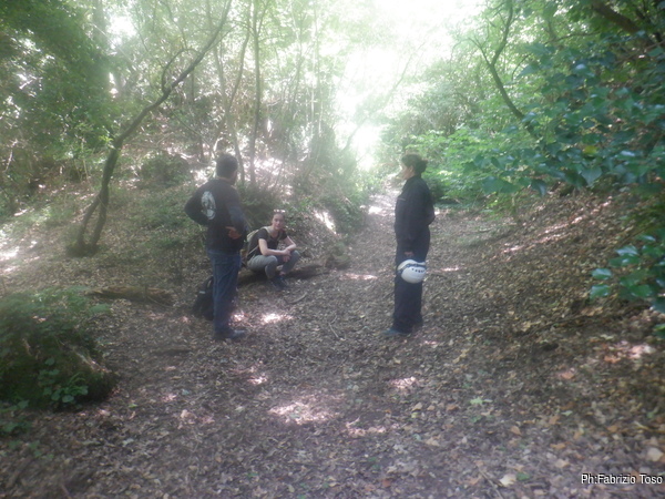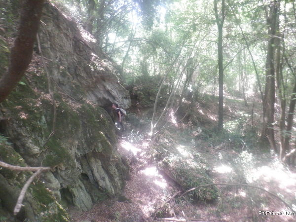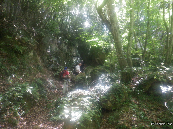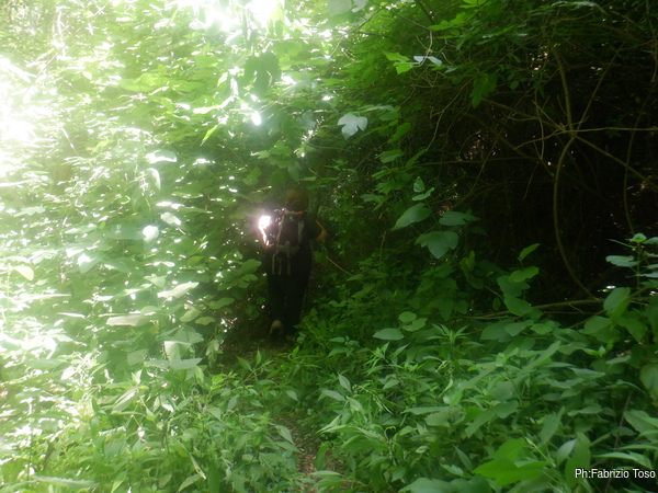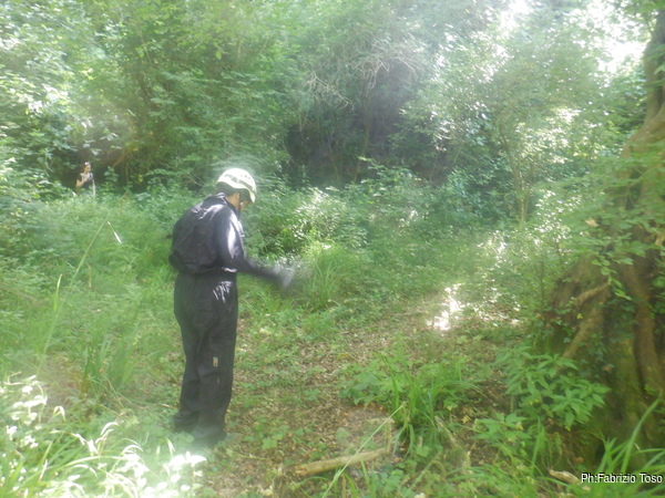 Camminiamo per un sentiero che sembra ricavato da poco tra rovi, ortiche e altre piante spinose. Le nostre guide ci raccontano che e’ una gradita sorpresa anche per loro, la settimana scorsa il sentiero non esisteva. A proposito, una delle nostre guide si chiama Gabriele e ha anche fatto il corso speleo qualche anno fa, poi pero’ ha preferito appendere il discensore al chiodo e andarsene in giro coi suoi amici.