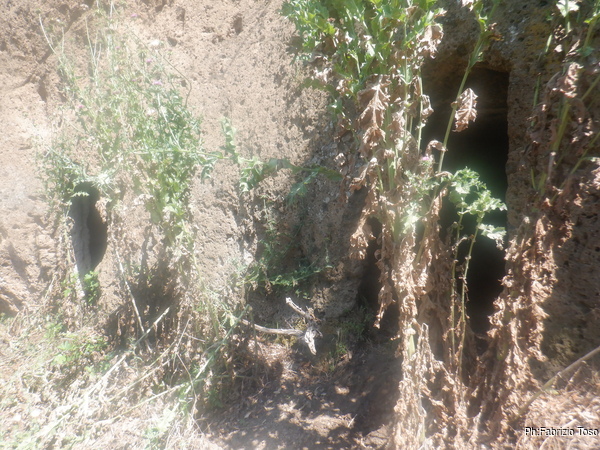 Decisi e compatti ci avviamo verso la grotta che hanno trovato. Strada facendo costeggiamo una parete di tufo con scavate alcune stanze che in un passato abbastanza recente sono state adibite a riparo per gli animali.