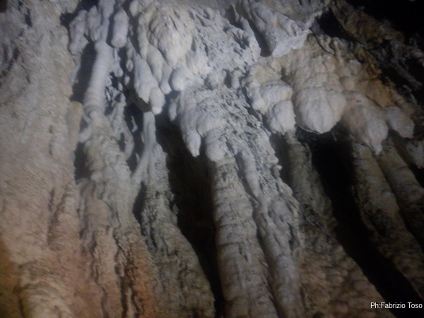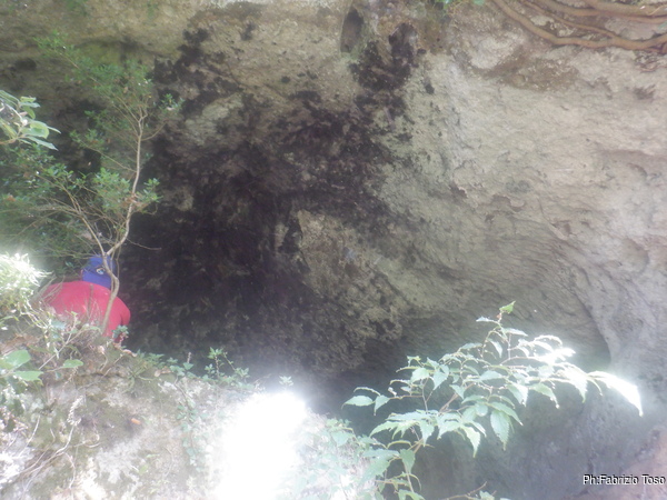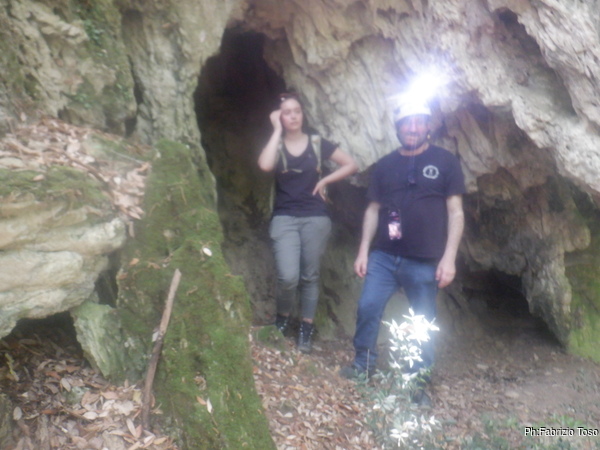 Dopo numerosi giri tra i rovi e altre difficolta’ tra cui qualche passaggio impervio, arriviamo alla grotta. Stavolta e’ grotta, e’ formata nel travertino, e’ anche bella a vedersi ma…non raggiunge le misure minime per poter essere inserita a catasto. Ce la guardiamo a lungo ma non troviamo prosecuzioni che ci permettano di dire che e’ catastabile. La salutiamo con un sospiro e proseguiamo.