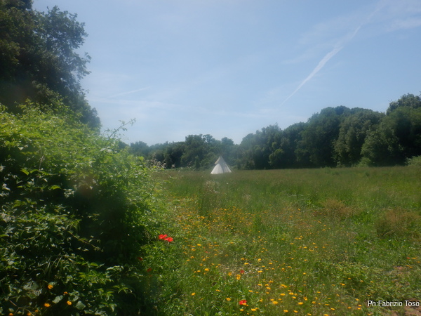 Arrivati alle auto scopro che anche noi dobbiamo spostarci per la prossima grotta. Riprendiamo le auto, imbocchiamo una strada che poi lasciamo per una sterrata, fino a uno spiazzo dove parcheggiamo. Nelle vicinanze qualcuno ha costruito un teepee, una foto se la merita.