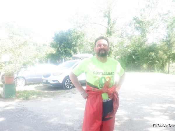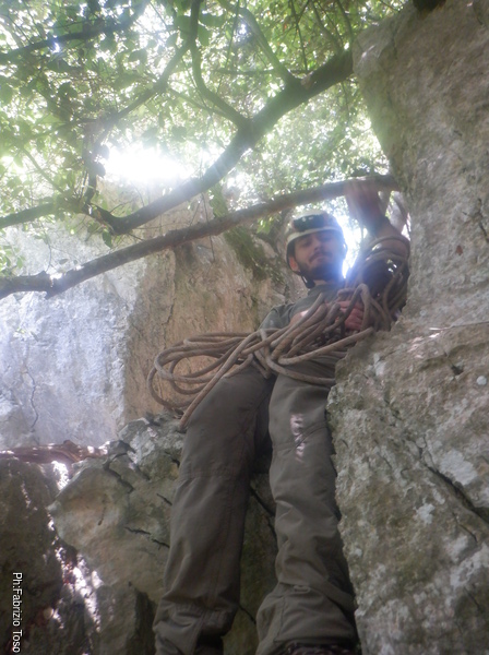 Luca sistema la corda in doppia passandola attorno a un robusto ramo d’albero poi me ne tira i capi. Prima di scendere aggancia alla corda il suo pesantissimo zaino che cala sino a me senza problemi. Dopo si cala anche lui. Una volta riuniti recupero la corda e lui ricompone la matassa che cosi’ riprende posto sulla mia schiena.