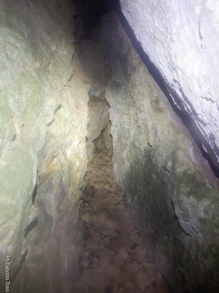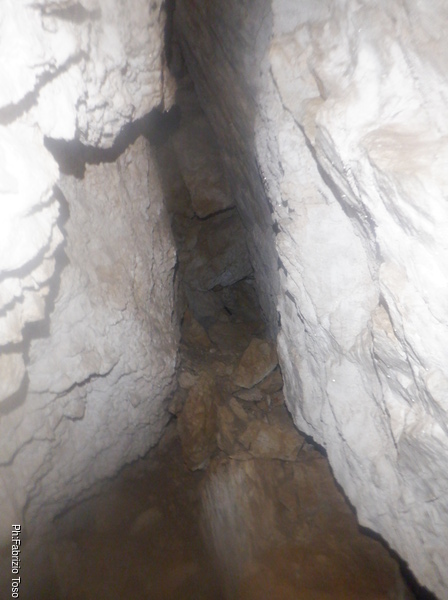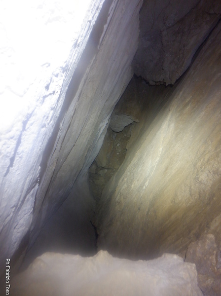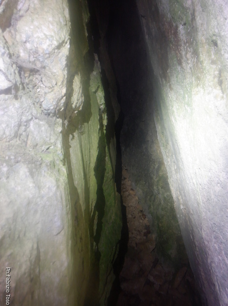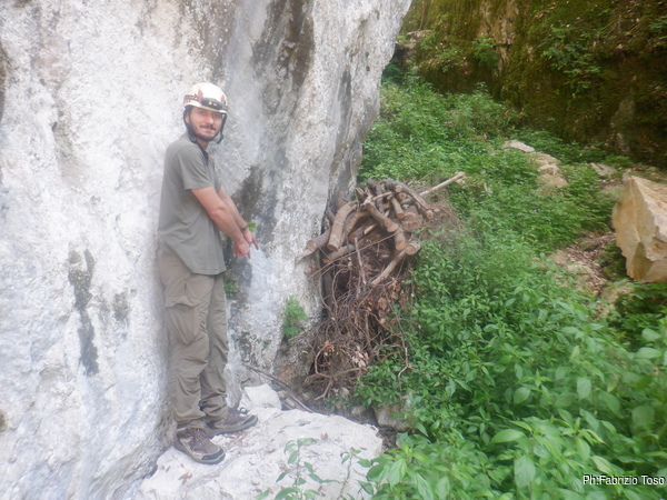 La gola sembra andare proprio nella direzione della grotta quindi con Luca proseguiamo speranzosi. Speranze che vengono infrante quando mi trovo di fronte un piccolo dirupo.