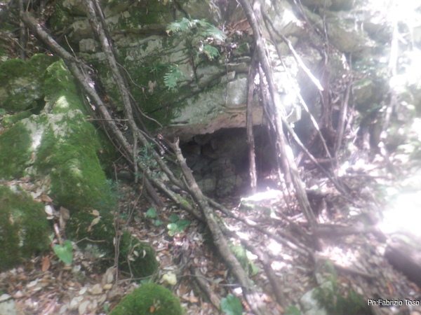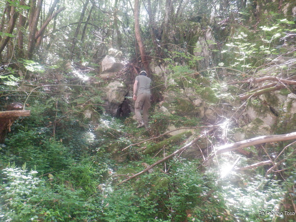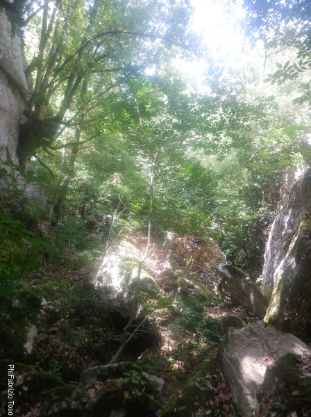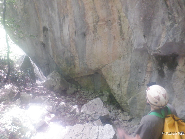 Dopo la delusione per la mancata grotta aspettiamo che Gabriele ritorni da una ricognizione sul sentiero, che continua verso il basso. Quando Gabriele torna con le pive nel sacco Luca ed io andiamo a inerpicarci tra i massi di crollo (o saranno erratici?). La via non e’ semplice quindi prima di proseguire sconsigliamo Maria di seguirci e Gabriele decide di restare con lei. Insieme andranno a cercare u’altra via per arrivare alla grotta che dobbiamo cercare (Grotta di Iacucera(LA1194)).