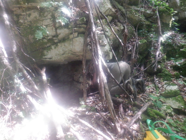 Quando torna e’ contento e porta buone notizie. La spaccatura va avanti per una dozzina di metri poi c’e’ un salto da 4 metri da scendere con la corda. Al lancio del sasso sembra prosegua sulla destra per almeno altri 5 metri. Abbiamo la nostra nuova grotta! Faccio le foto all’ingresso.