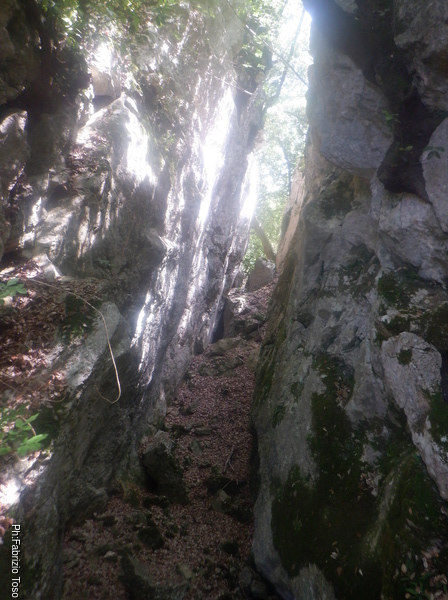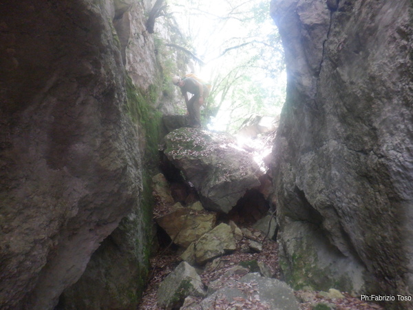 Ci dividiamo cosi’ in due gruppetti con l’accordo di rivederci o alla grotta o alla macchina. Passata la prima zona impervia con una miriade di massi di crollo, che nascondono insidiosissimi quanto inutili vuoti, ci troviamo in una gola dalle alte pareti che penso sia parallela alla gola che ospita la falesia.