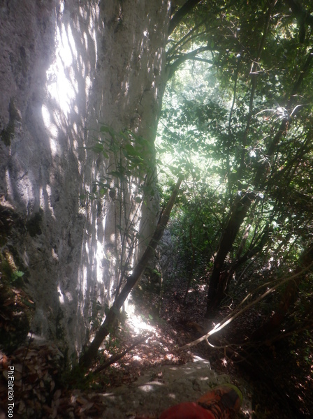 Si tratta quindi di tornare indietro a raggiungere i nostri amici. Si potrebbe ripetere al contrario la strada appena fatta ma l’idea non ci sorride. Alla fine optiamo per seguire la parete con la speranza che ci porti al sentiero che abbiamo lasciato. Questa soluzione ci piace anche perche’ cosi’ possiamo vedere eventuali buchi lungo la parete.