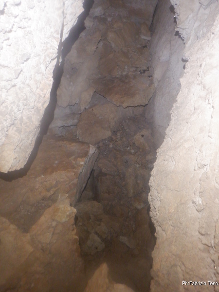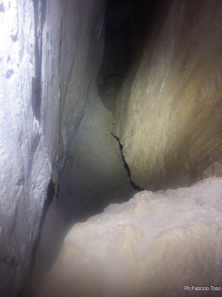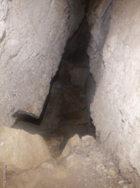 Pochi passi e gia’ possiamo rallegrarci di aver fatto la scelta giusta. Troviamo una spaccatura che sembra proprio grotta. Butta fuori tanta aria gelida e ci sono anche dei pipistrelli. Luca, che e’ l’atleta del gruppo si addentra a visionare la possibile nuova grotta.