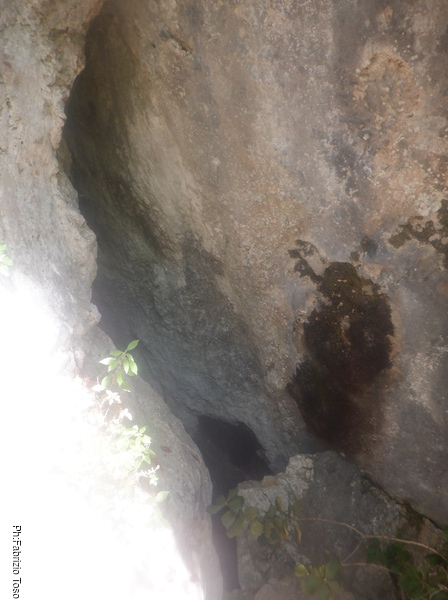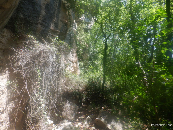 Siamo ora alla base della parete di roccia. Un rapido esame nella direzione dove dovremmo andare per trovare la grotta ci sconsiglia vivamente di proseguire, e’ un intrico di quei tenacissimi spini che chiamo “stracciabraghe”. E’ impossibile passare oltre.