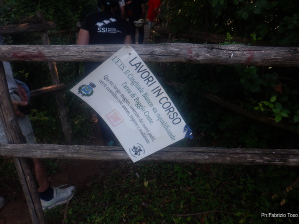 Passiamo un primo cancello in legno, un cartello ci informa che la zona era in via di riqualificazione. Opera meritoria che forse, viste le condizioni del cartello, e’ gia’ terminata!