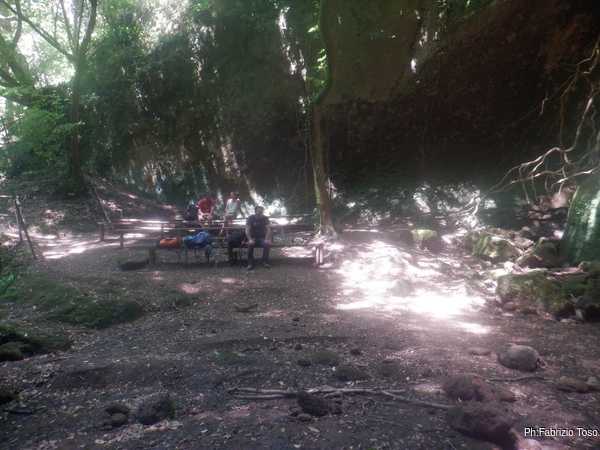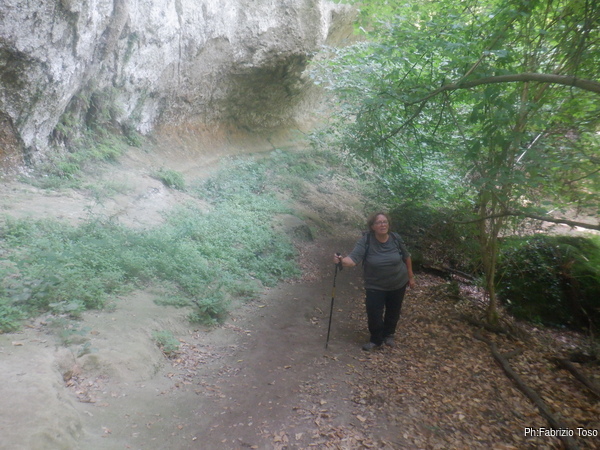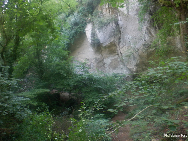 Arriviamo alla parete dove cercheremo le grotte. A sinistra il sentiero porta ad un eremo che magari andremo a visitare dopo. Noi proseguiamo a destra per poi prendere per il bosco e salire sopra alla parete.