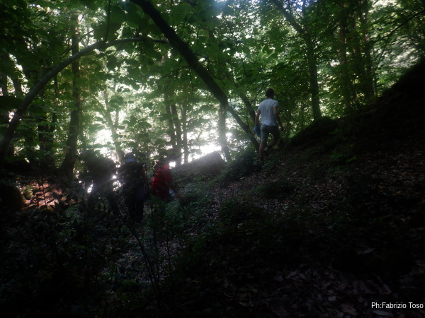 Qua il sentiero e’ appena accennato e qualche volta nemmeno quello. Per fortuna pero’ almeno abbiamo l’ombra che limita un poco, ma non troppo, il caldo di questa giornata.