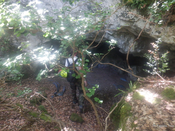 Martina, la nostra esploratrice titolare inizia a prepararsi mentre il “nostro” Gabriele recupera una corda da assicurare al vicino albero per facilitare ingresso e uscita dalla grotta.