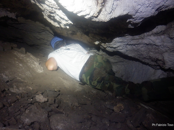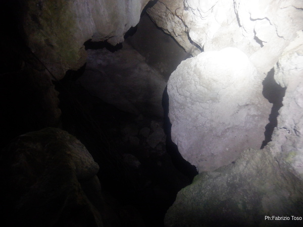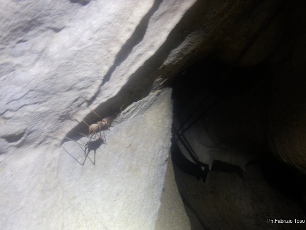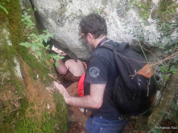 Insieme a Martina, che nel frattempo mi ha raggiunto, chiamiamo a gran voce i Gabriele perche’ ci raggiungano a vedere quello che abbiamo scoperto. Quando Gabriele locale arriva riconosce nel buco la grotta che aveva trovato tempo fa.