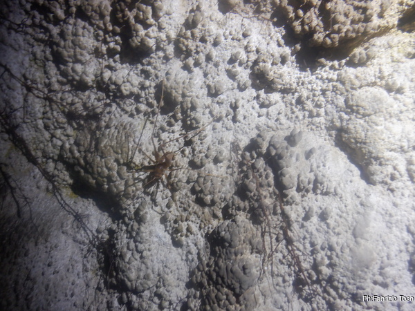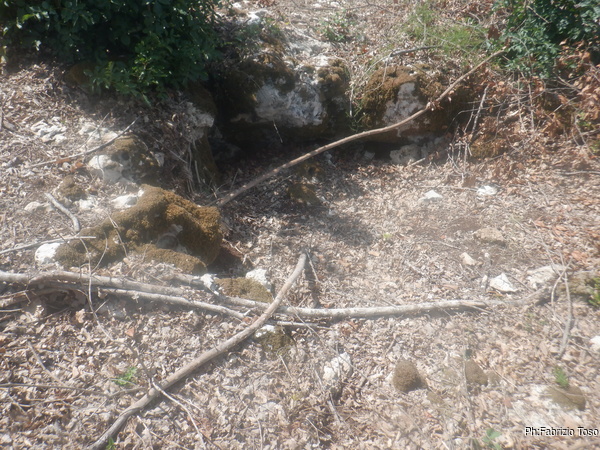 Stavolta prendiamo un sentiero che passa leggermente piu’ in basso rispetto a quello dell’andata e, strada facendo, vediamo altri buchi dall’aspetto interessante pero’ Gabriele locale ci dice di averli gia’ visti lui e che non sono realmente interessanti. Visto il caldo opprimente e la sete incombente, ho terminato l’acqua che mi ero portato, evito di fare faticose deviazioni per verificare, anche la mia curiosita’ ha un limite.