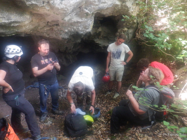 La mattina verso le 10.30 arriviamo finalmente al luogo dell’appuntamento e ritroviamo i nostri amici del posto che per diletto girano per questi boschi. Oggi hanno da mostrarci delle grotte, un paio conosciute e una nuova. Dopo i saluti ci prepariamo svelti e poi facciamo un paio di foto di gruppo. Oggi Vittorio purtroppo non potra’ accompagnarci, pero ‘ ci lascia nelle capaci mani di Gabriele, Andrea e Francesco che ci guideranno in questo dedalo di sentierini.