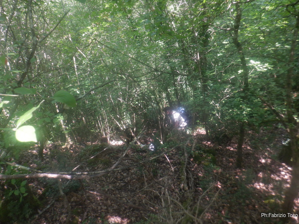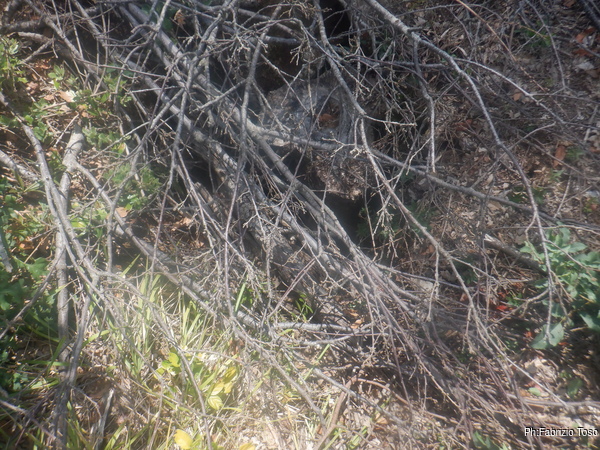A un certo punto i due Gabriele si addentrano in una zona ancora da disboscare mentre io rimango nella zona assolata ma pulita a guardarmi attorno. Tra un buco e l’altro trovo anche questo che e’ palesemente stato riempito con un tronco e coperto con svariati rami.