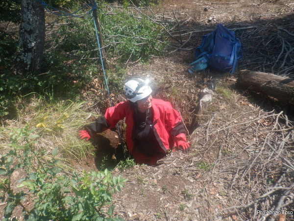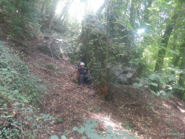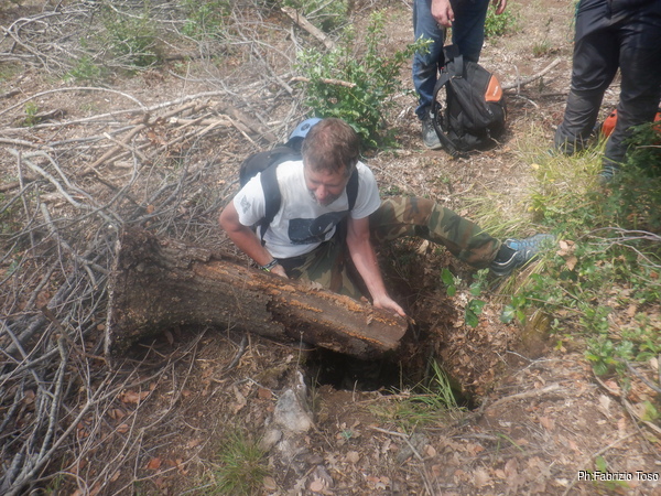Valutiamo se vale la pena tentare di estrarre il tronco che ostruisce l’ingresso. Io sono scettico ma Gabriele non si da’ per vinto e inizia a spostare i rami. Io cerco di dare una mano ma riesco solo ad ottenere di cadere di nuovo e procurarmi l’ennesimo quanto indesiderato livido.