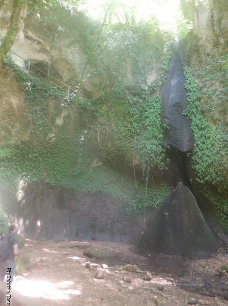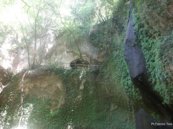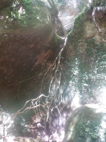 Inganno l’attesa facendo qualche foto, In alto a sinistra si intravede l’eremo, sulla destra la formazione nera tra il verde della vegetazione segna il passaggio dell’acqua. Gabriele mi conferma che nei periodi meno caldi da li’ scende una bella cascata.