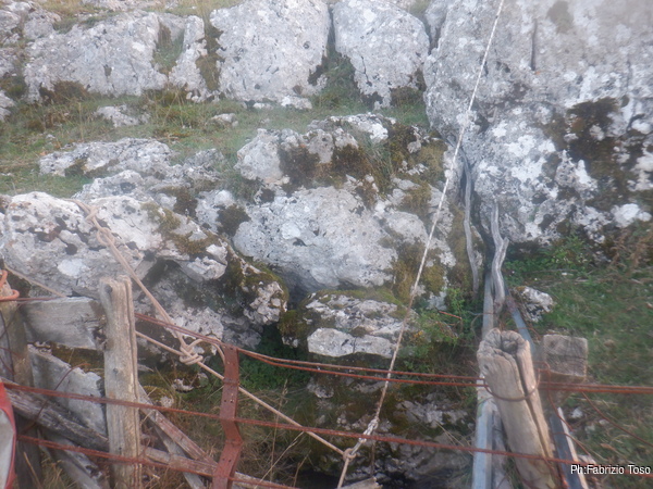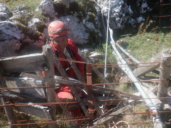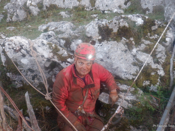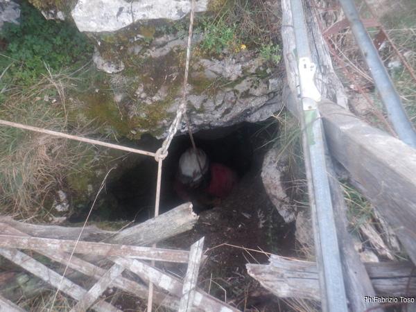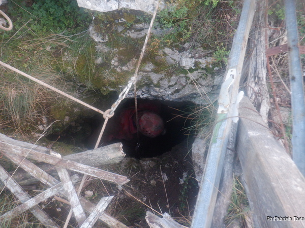 Dopo qualche minuto riusciamo ad armare coralmente la partenza, nonostante il tempo speso e un rivolo di sudore dietro la schiena devo dire che viene benone. Sistemata la partenza del pozzo saluto Gabriele che oggi andra’ in giro nei dintorni a fare ricognizione e ricerca di ingressi e scendo per raggiungere Nerone. Dopo i primi 5 metri faccio sosta a sistemare il frazionamento ma devo attendere che Luca mi raggiunga poiche’ ho scordato di prendere un cordino per farlo.