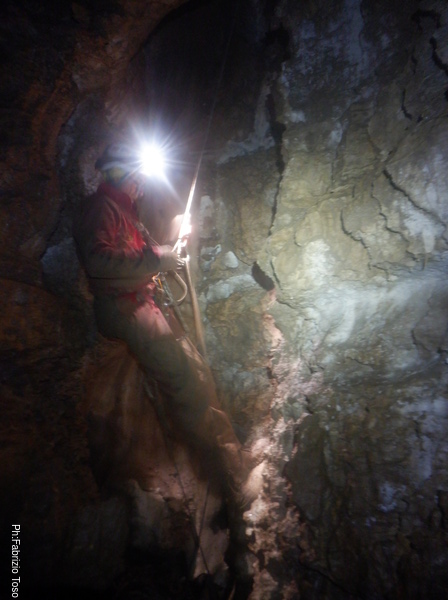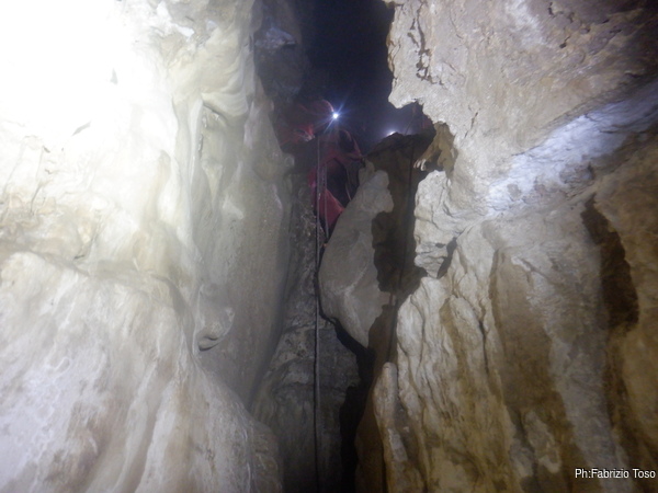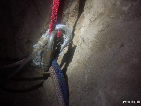 Dopo una breve sosta al laghetto proseguiamo il meandro fino al pozzo successivo dove, su una comoda cengia a 5 metri dalla partenza del pozzo si puo’ arrivare grazie a un traverso alla prosecuzione del meandro. Il traverso in un punto ha un moschettone in condizioni non buone, anzi pessime, per fortuna e’ stato doppiato con una robusta maglia rapida.