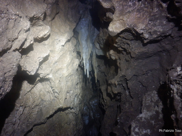 Quando Luca mi raggiunge iniziamo a darci da fare per dare uno sguardo dentro alla spaccatura. Mentre aspetto faccio una foto a qualche stalattite.