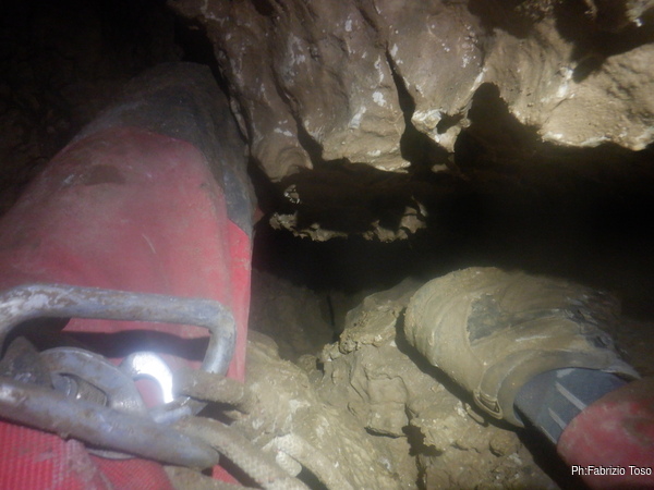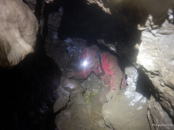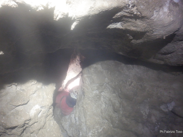 Senza il masso Luca ora riesce a intravedere quello che c’e’ avanti. Sembra ci sia una prosecuzione comoda ma solo dopo un blocco di roccia. Gli passo la fotocamera ma non riesce a fare una foto che spighi cosa ha visto.