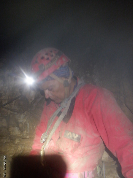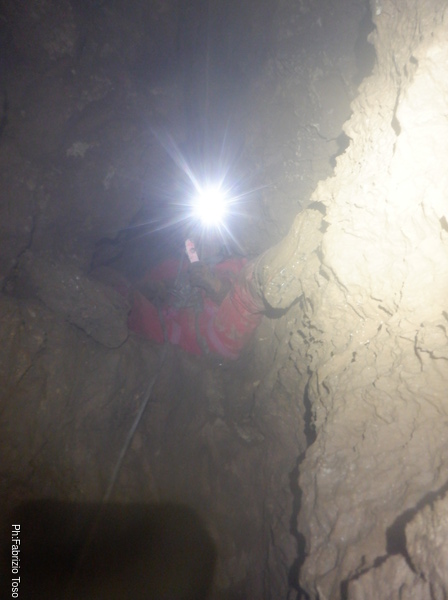 Dopo la mia discesa ci raggiungono velocemente sia Luca che Emilio. Nel proseguire la grotta, fatta da una sequenza di meandri stretti e piccoli pozzi mi dimentico completamente della fotocamera anche perche’ sono impegnato a fare il cambio delle corde nei pozzi che incontriamo. Chiedo a Nerone, memoria storica della esplorazione di questa grotta, da quanto tempo siano qua le corde e quando mi risponde che avranno almeno 20 anni non posso far altro che concordare circa l’opportunita’ di cambiarle.