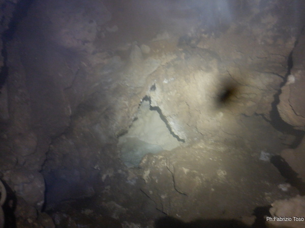 Arrivato alla base del pozzo mi guardo attorno, ci sono sassi caduti dall’alto e una pozza d’acqua profonda una decina di centimetri. Inizialmente non vedo alcunche’ di interessante ma completando il giro devo ricredermi, proprio alle mie spalle rispetto a quando sono sceso c’e’ una bella spaccatura, quasi percorribile.