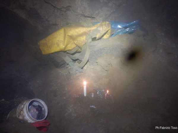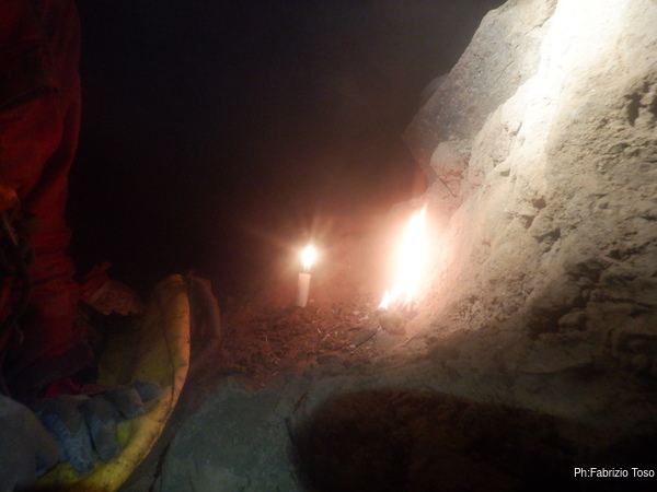 Quando Luca torna dalla sua perlustrazione ci aggiorna dicendo che anche qua c’e’ del lavoro da fare per proseguire. Torniamo insieme alla sala del laghetto. Salgo per primo il pozzo e arrivo alla sala dove Emilio e’ rimasto ad aspettarci facendo esperimenti incendiando il fango impregnato di cera (paraffina?) delle candele.