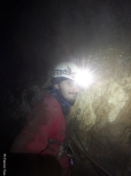 Luca va avanti sul traverso, doppia un attacco con uno dei nostri moschettoni e si avvia verso la prosecuzione del meandro. Mentre mi accingo a seguirlo dietro di me sento arrivare Nerone.