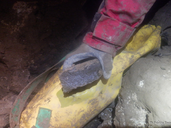 Per prima cosa rompo a martellate un piccolo diaframma di marciume vario che faceva da diga alla pozza d’acqua alla base del pozzo. Rotto l’argine in pochi minuti la pozza si svuota gorgogliando allegramente dentro la spaccatura.