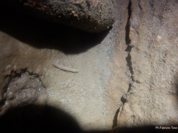 Nell’attesa cerco bestiole di grotta da fotografare e finalmente ne trovo una. A prima vista mi sembra un vermetto bianco di nemmeno 2 centimetri ma poi a guardare meglio noto che forse si tratta di un minuscolo millepiedi. Gli faccio un intero reportage fotografico ma ve lo risparmio!