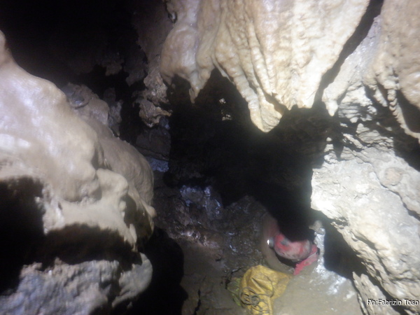 Fatto tutto il possibile in questo punto Nerone insiste per andare avanti a dare uno sguardo al meandro dove per ora termina la grotta. Risaliamo tutti verso la sala del laghetto.