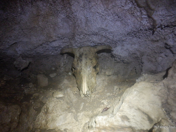 Ancora un piccolo sforzo e siamo alla sala alla base del pozzo d’ingresso. Quando ci arrivo Emilio e’ gia’ salito. Ad aspettarmi c’e’ solo lo storico teschio immusonito.