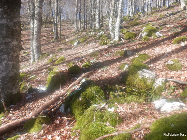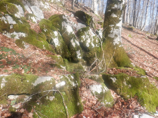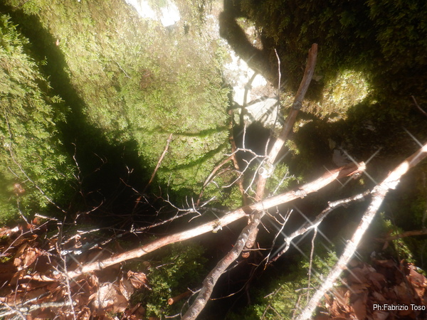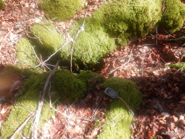 Lasciato il sentiero seguo il mio GPS fino ad un’area fittamente cosparsa di sassi affiorant, tutti ricoperti da un robusto strato di muschio. Trovo subito un primo buco, sono arrivato a quanto sembra.