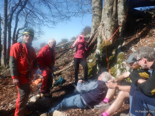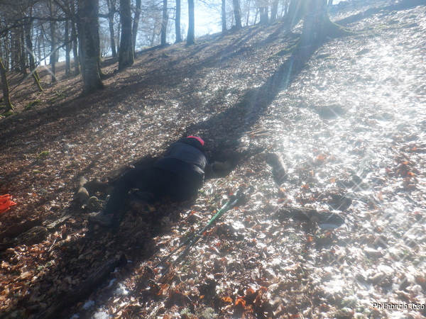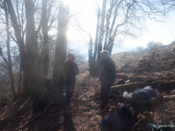 Quando siamo tutti pronti, io mi sono tolto l’attrezzatura e ho riformato lo zaino pesante, ci carichiamo il basto sulle spalle e partiamo di buon passo per raggiungere le auto. Fabio guida il gruppo. Al ritorno seguiamo il sentiero, e’ molto piu’ comodo e meno faticoso, Solo Marco e Piero si concedono di tagliare un paio di curve.