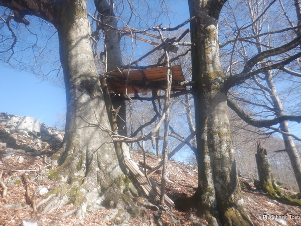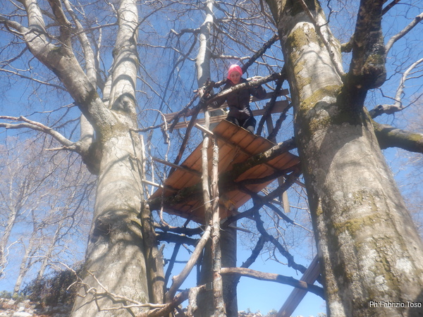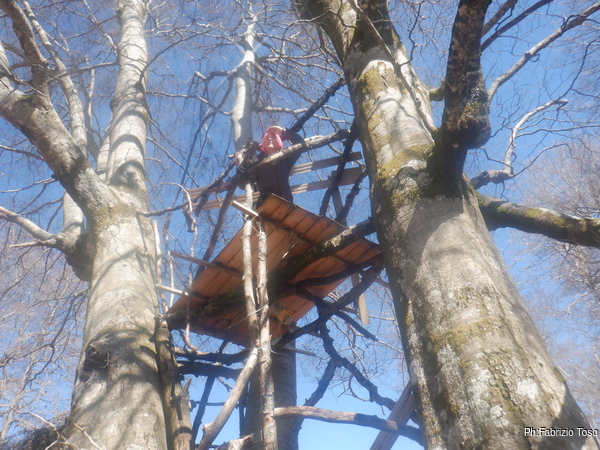 Strada facendo incontriamo una piattaforma costruita su un albero e Laura ci si avventura sopra.